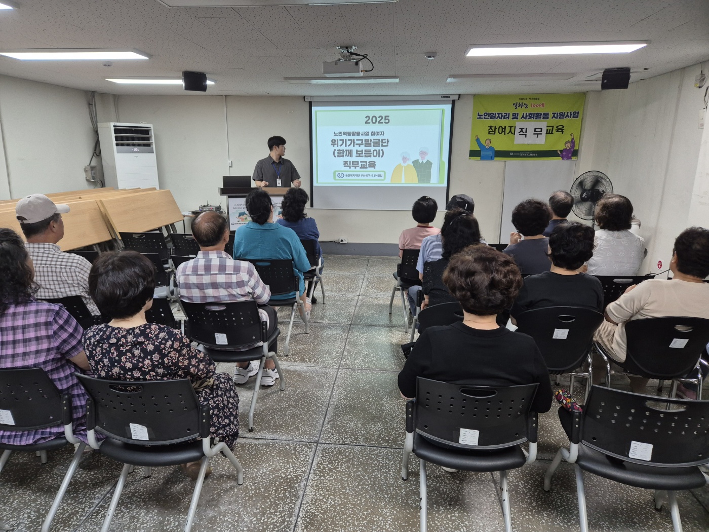 일자: 2025. 9. 9. (화)   대상: 위기가구발굴단(함께 보듬이) 참여자   장소: 부산북구시니어클럽 지하교육장   내용: 위기가구발굴단(함께 보듬이) 참여자에게 근무 시 수행 업무 및 방법, 주의사항을 숙지하여 최적의 서비스를 제공할 수 있드록 직무교육을 실시함.   |