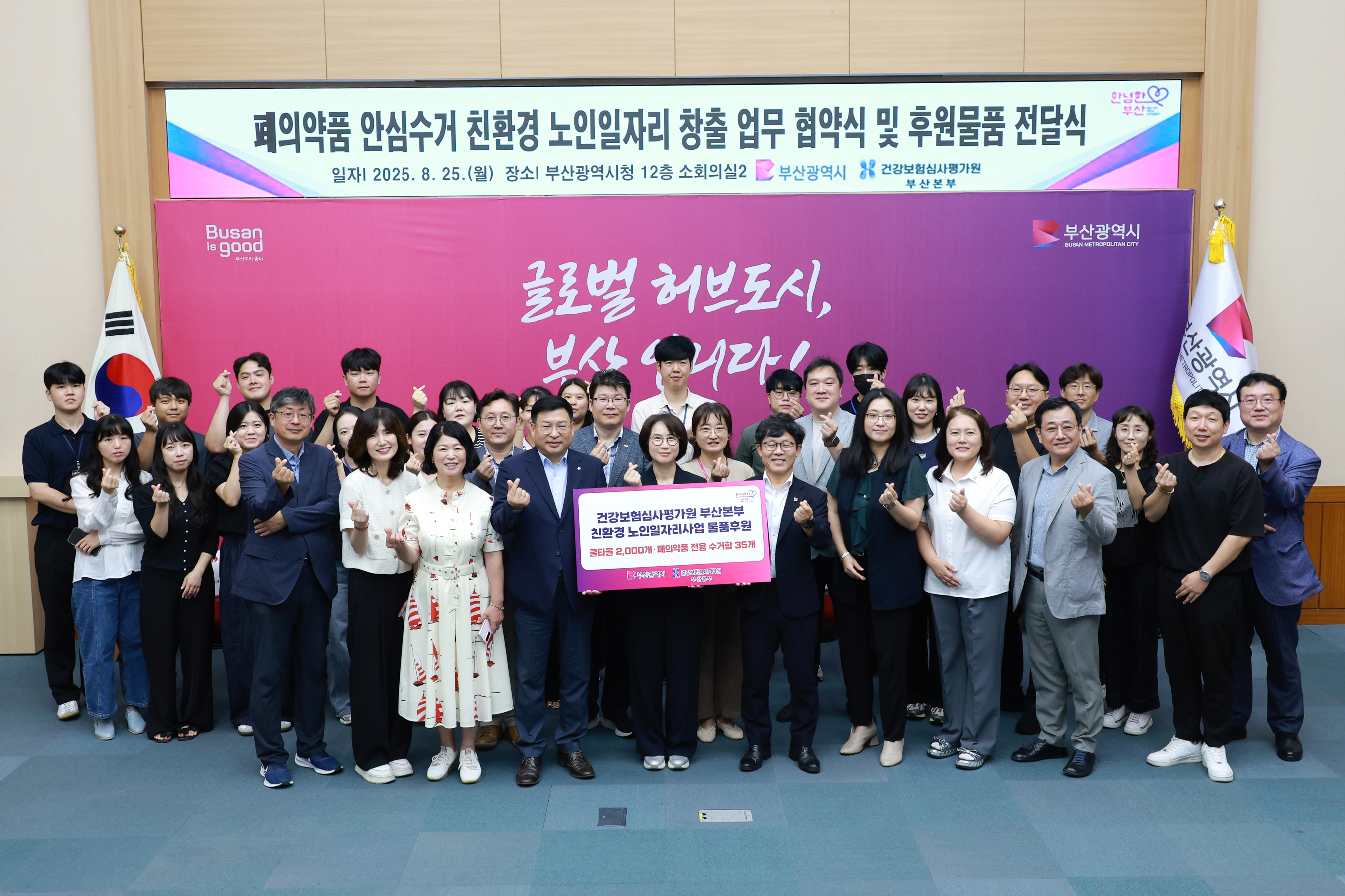 일자: 2025. 8. 25. (월)   대상: 부산시니어클럽협회 회장단 및 16개 시니어클럽 관장 및 종사자 등   장소: 부산광역시 시청 12층 소회의실 2   내용: 고령화로 의약품 복용이 늘면서 폐의약품 발생량이 매년 증가함에 따라 부산광역시-건강보험심사평가원 부산 본부와 16개 시니어클럽 관장 및 종사자 등이 협력하여 '처치곤란 폐의약품 찾아가는 수거 서비스'를 통해 지속 가능한 친환경 노인일자리 창출을 추진하기 위한 협약식에 참석함. |