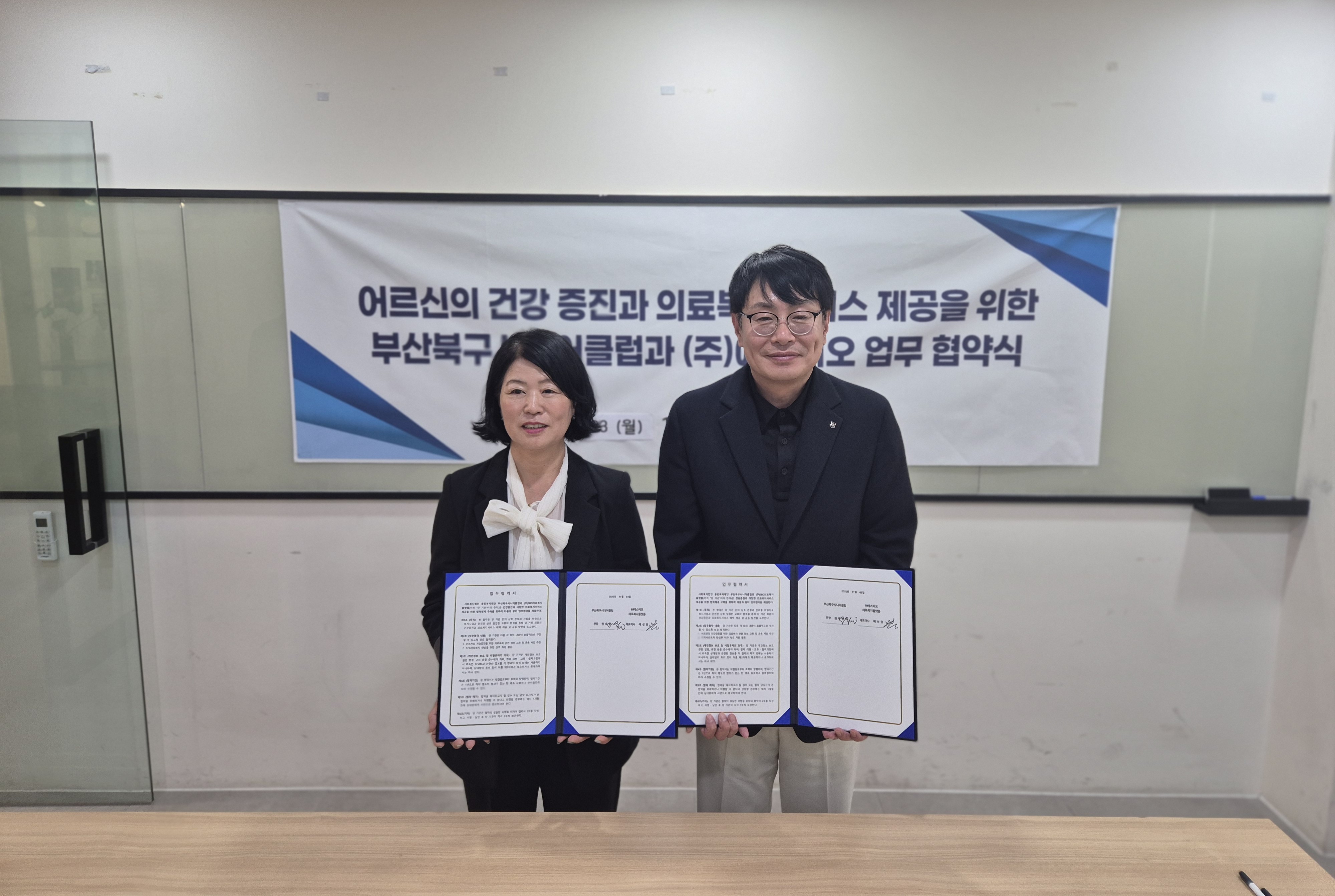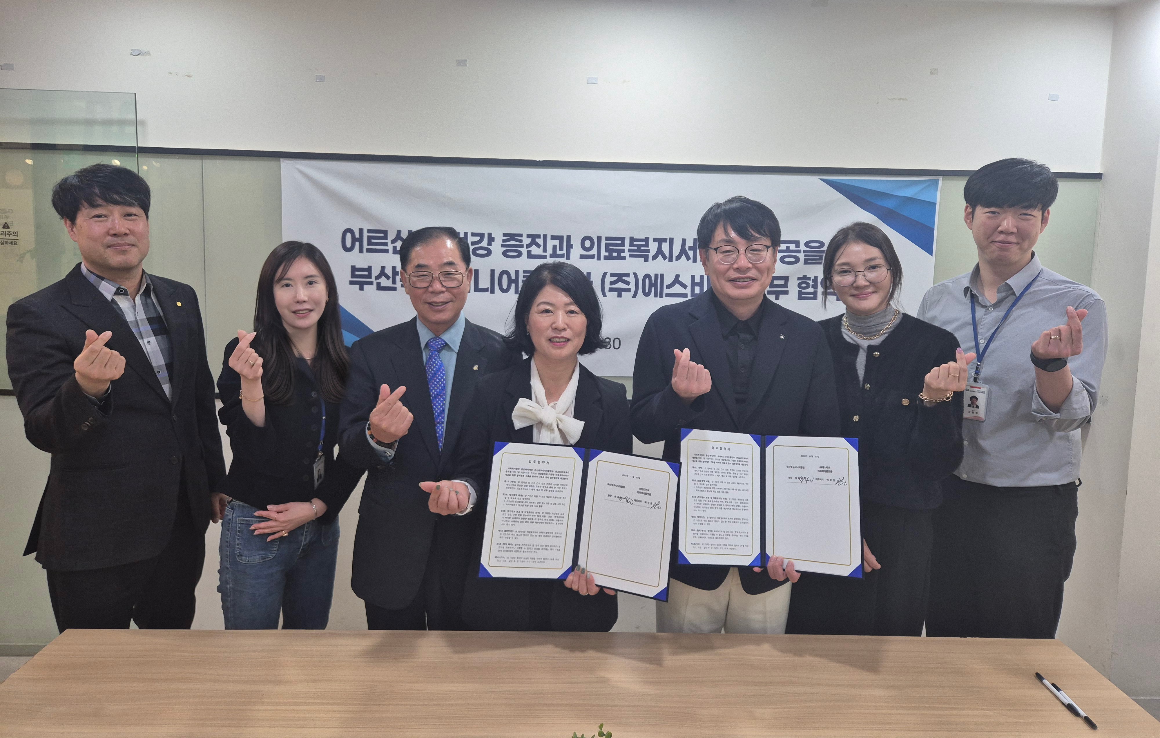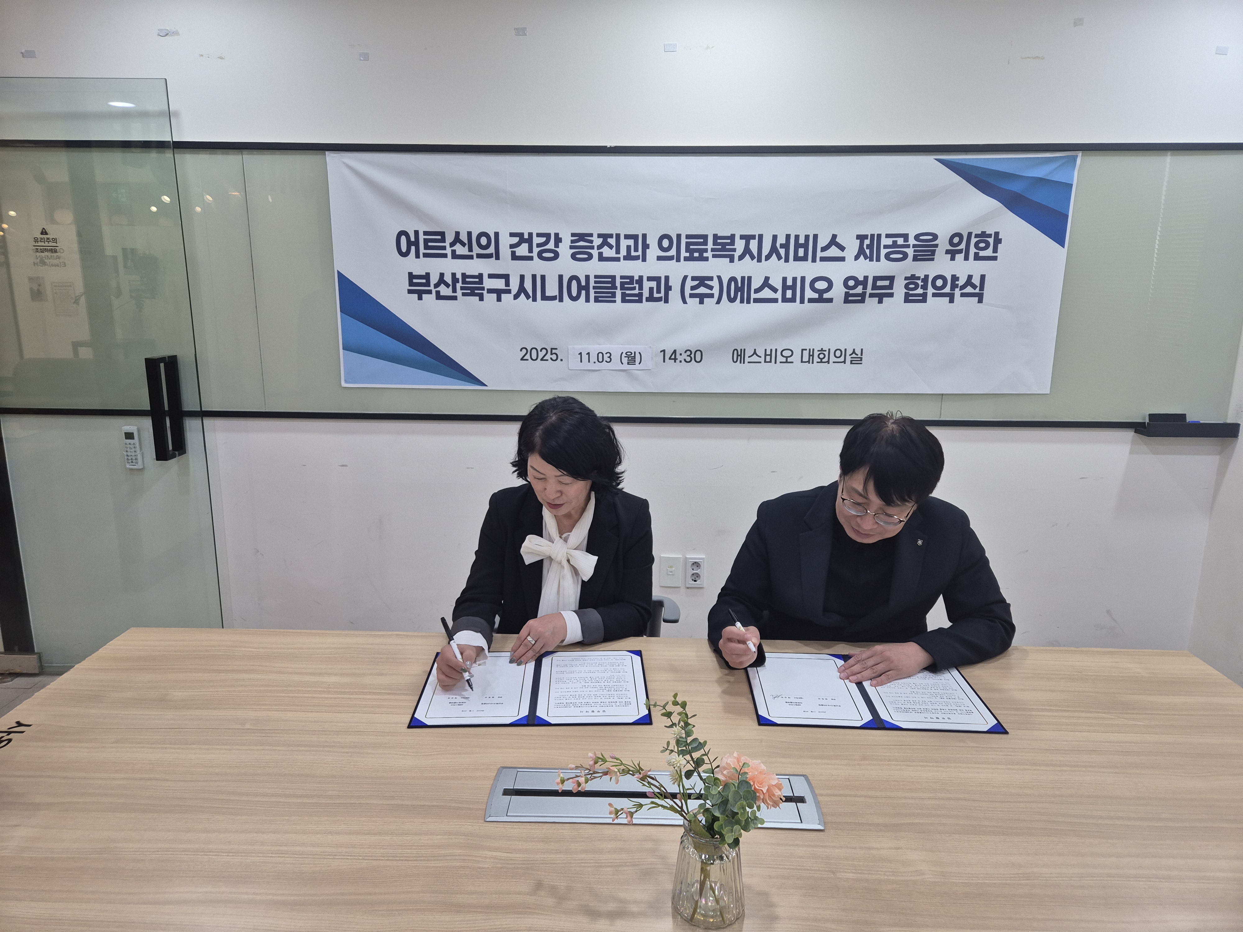 1. 일자 : 2025. 11. 3.(월)   2. 대상 : (주)에스비오, 부산북구시니어클럽   3. 장소 : 부산 진구 쥬디스태화 9층 60호   4. 내용 : 어르신의 건강증진과 의료복지서비스 제공을 위한 부산북구시니어클럽과 (주)에스비오 업무 협약식을 진행함.   |
