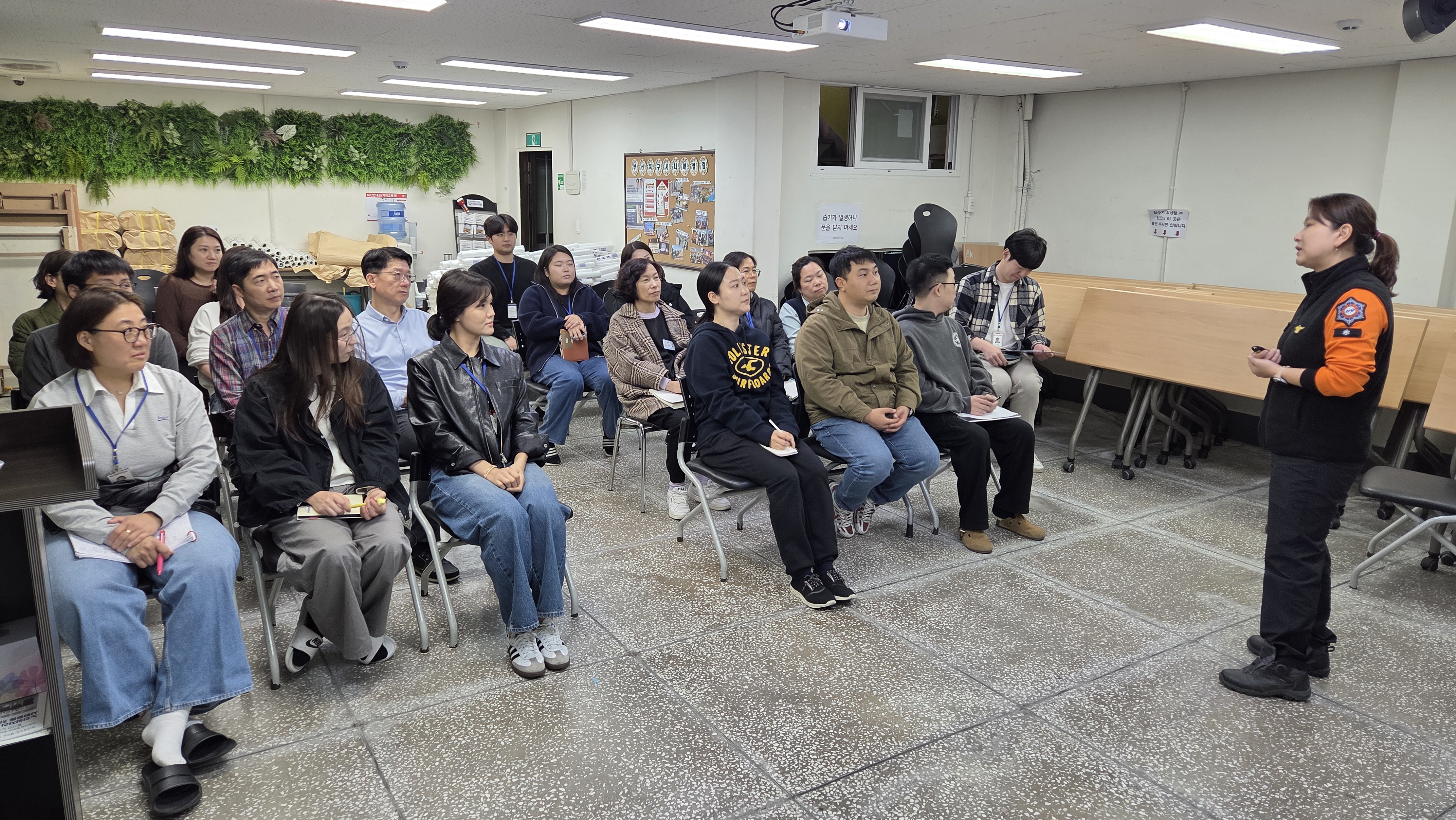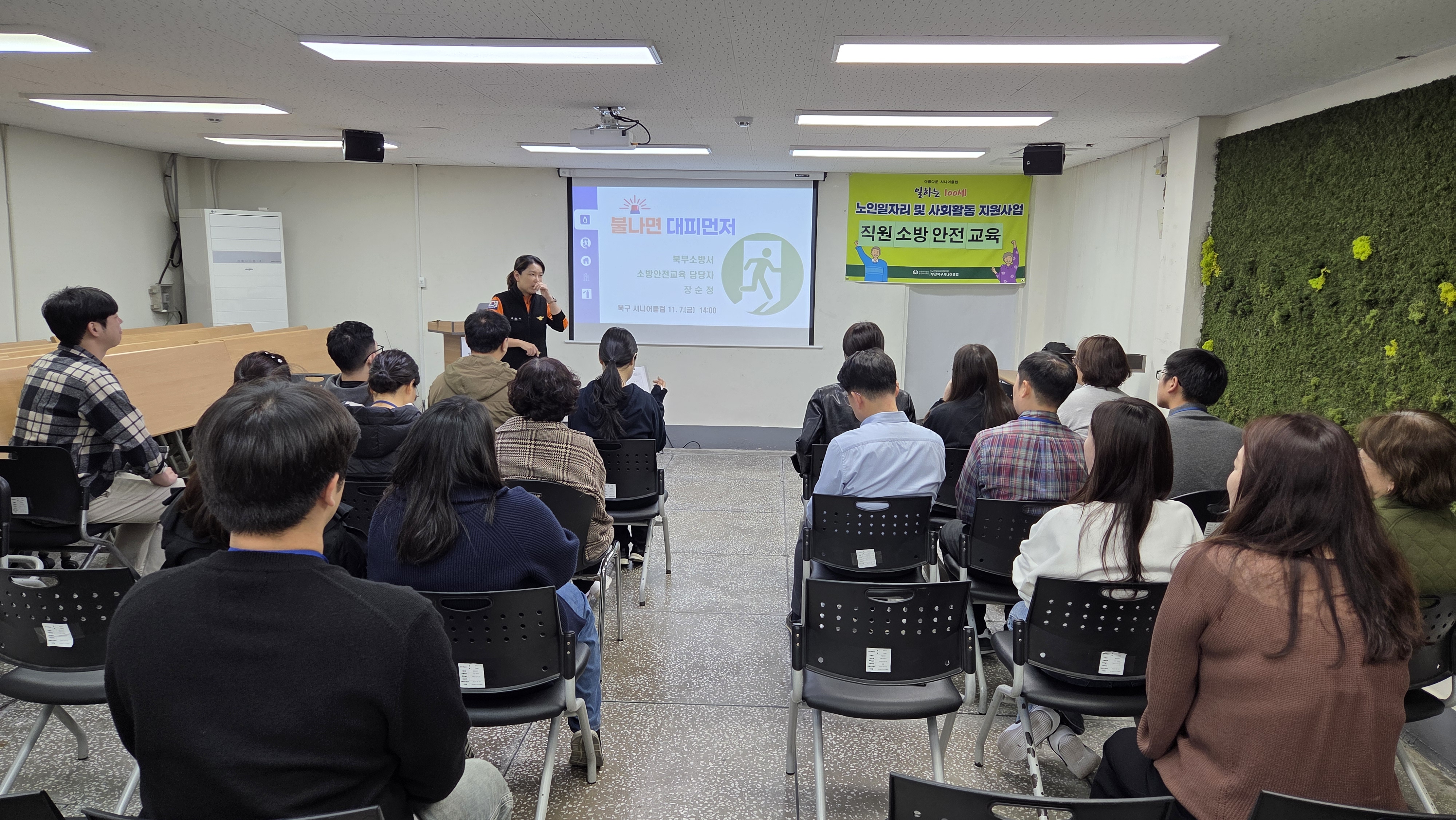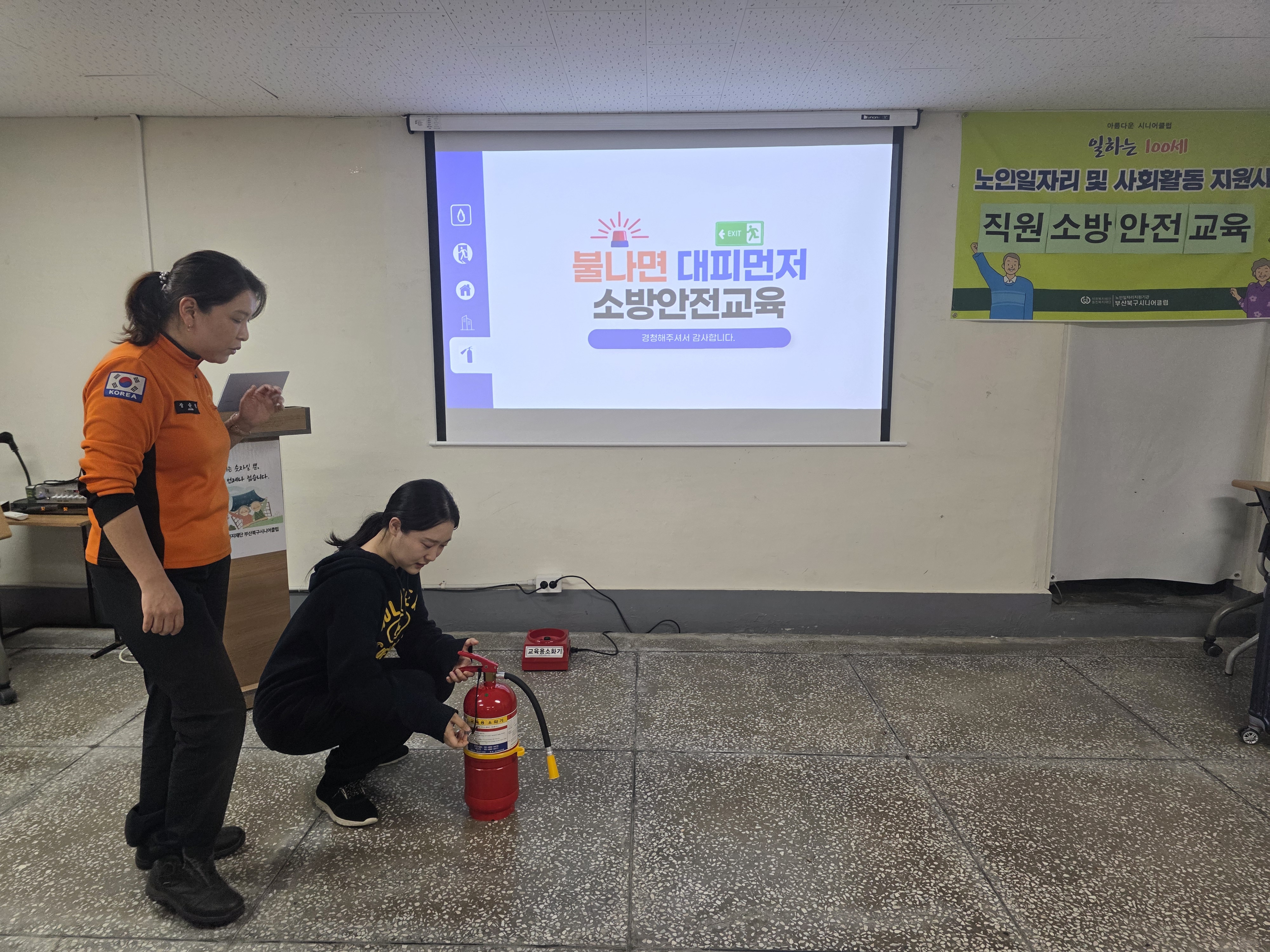 1. 일자 : 2025. 11. 7.(금)   2. 대상 : 부산북구시니어클럽 전직원   3. 장소 : 부산북구시니어클럽 지하교육장   4. 내용 : 화재 재난대비 방법 및 소방시설의 종류 및 사용방법, 소화기 분사 실습 등 종사자 소방안전교육을 실시함.   |