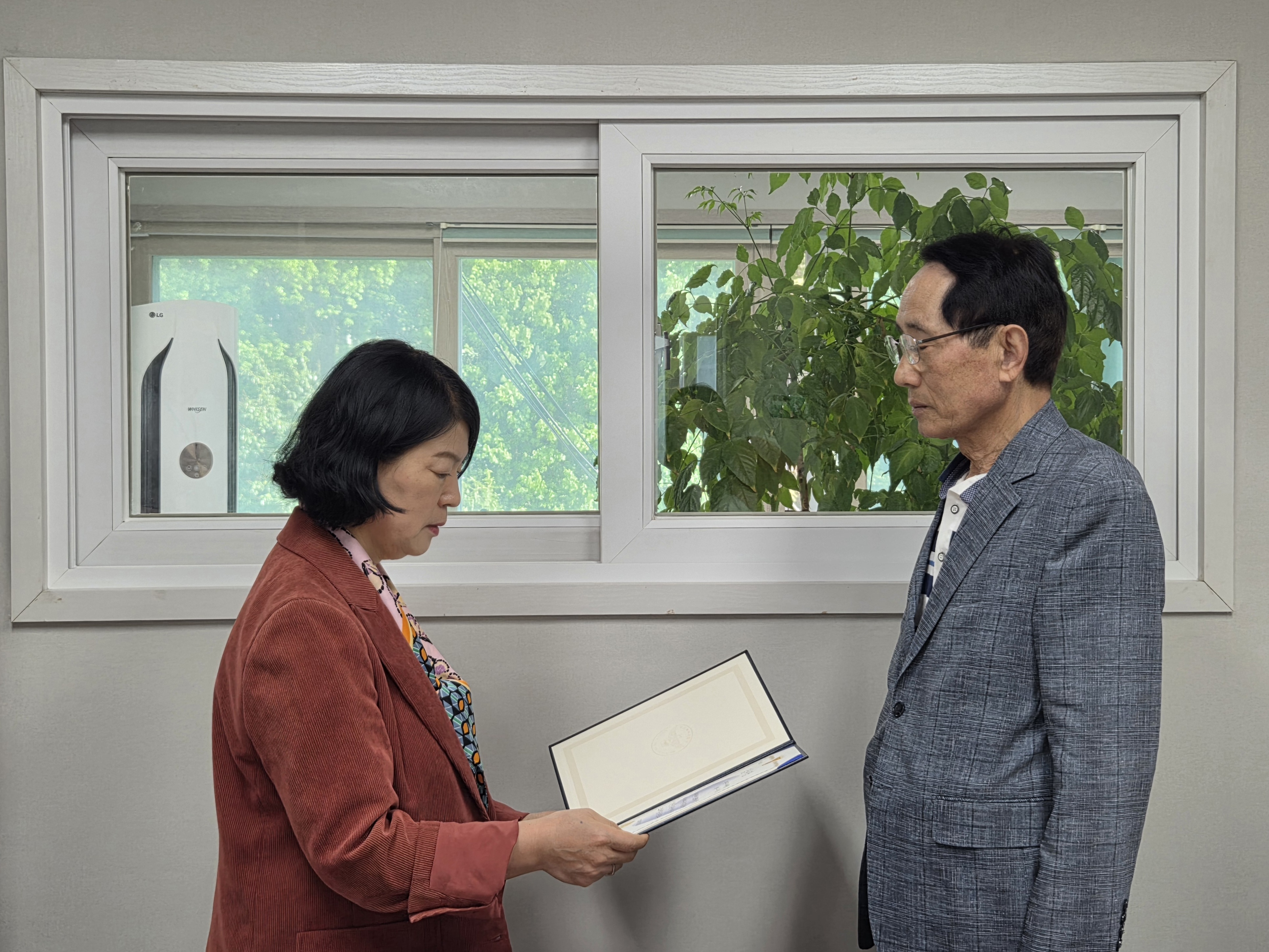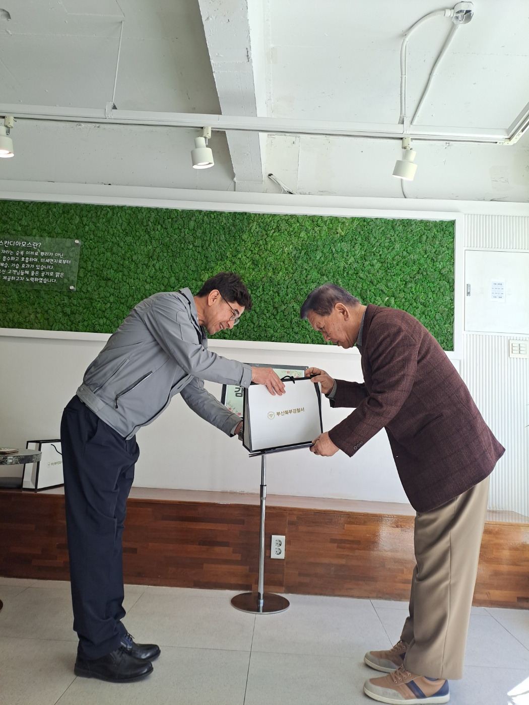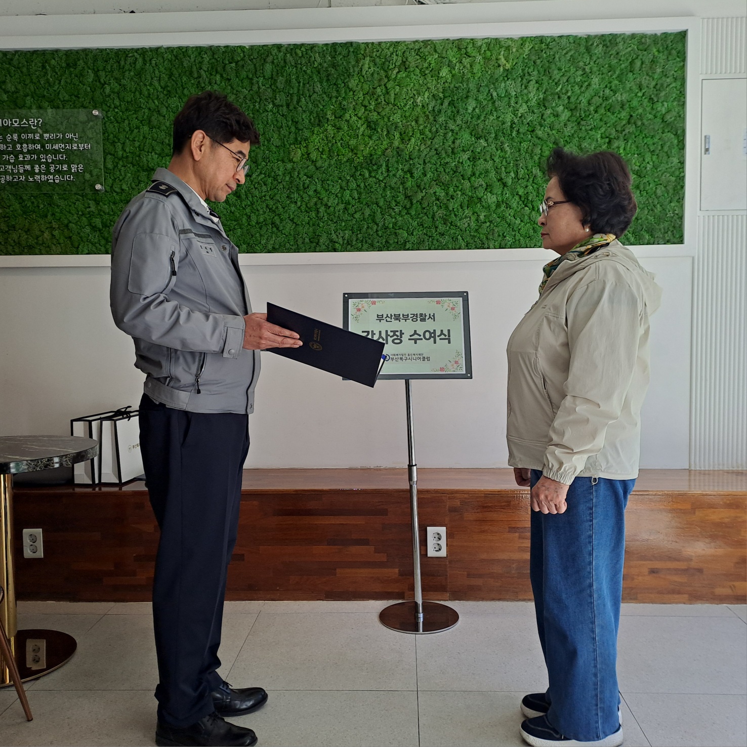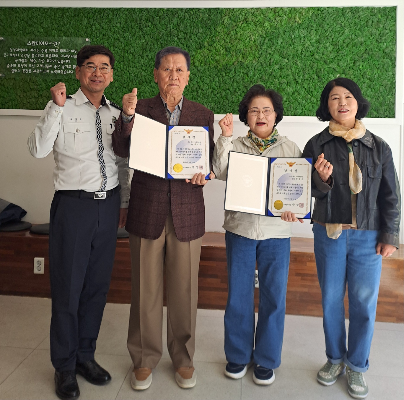 1. 일시 : 2026. 4. 9.(목) 2. 대상 : 시니어학교깔끔지킴이 차OO, 펭수안전지킴이 구OO, 임OO 3. 장소 : 부산북구시니어클럽 1층 숲속의요정Coffee 4. 내용 : 부산북부경찰서에서 실시한 2026년 어린이보호구역 안전시설물 합동점검에 우수한 의견서를 제출하여 북부경찰서장 감사장을 수여받음. - 공적내용 -  차OO : 금명초등학교 횡단보도 대기 시간 감소 조치 요청 구OO : 학사초등학교 앞 횡단보도 신호등 잔여 보행시간 표시 요청 임OO : 백산초등학교 정문 앞 도로정비를 통한 위험요소 제거 요청 |