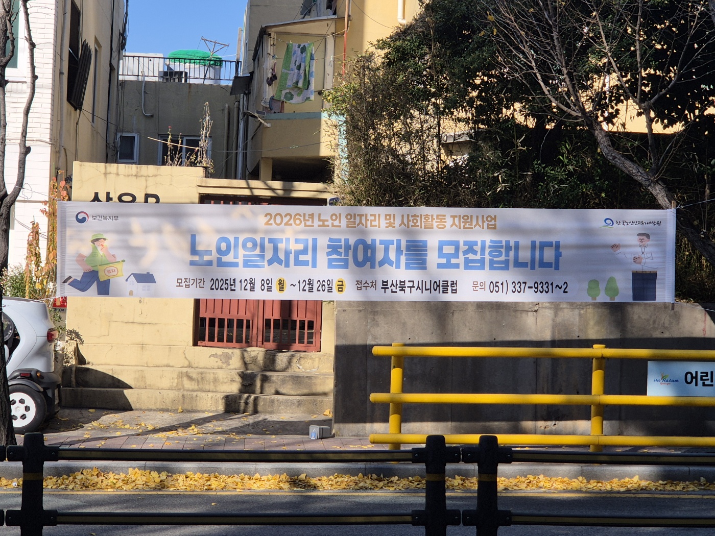 ※ 모집기간 : 2025년 12월 8일(월) ~ 2025년 12월 26일(금)   ※ 접수시간 : 10:00~17:00   ※ 모집대상 : 65세 이상 (일부 사업은 60세 이상 참여 가능)   ※ 모집분야 : 노인공익활동사업, 노인역량활용사업, 공동체사업단   ※ 접 수 처 : 부산북구시니어클럽   ※ 구비서류: 주민등록등본(3개월 이내), 증명사진 1매, 자격증(소방안전관리자 관련, 보육교사, 사회복지사, 사서자격증, 컴퓨터자격증, 바리스타자격증)   ※ 문 의 : 051-337-9331~2   ※ 접수는 선착순으로 이루어지지 않습니다.   인원이 몰릴 경우 기관이 혼잡해질 수 있고, 날이 추우니 정해진 접수기간 내에서 방문해주시길 바랍니다.   |