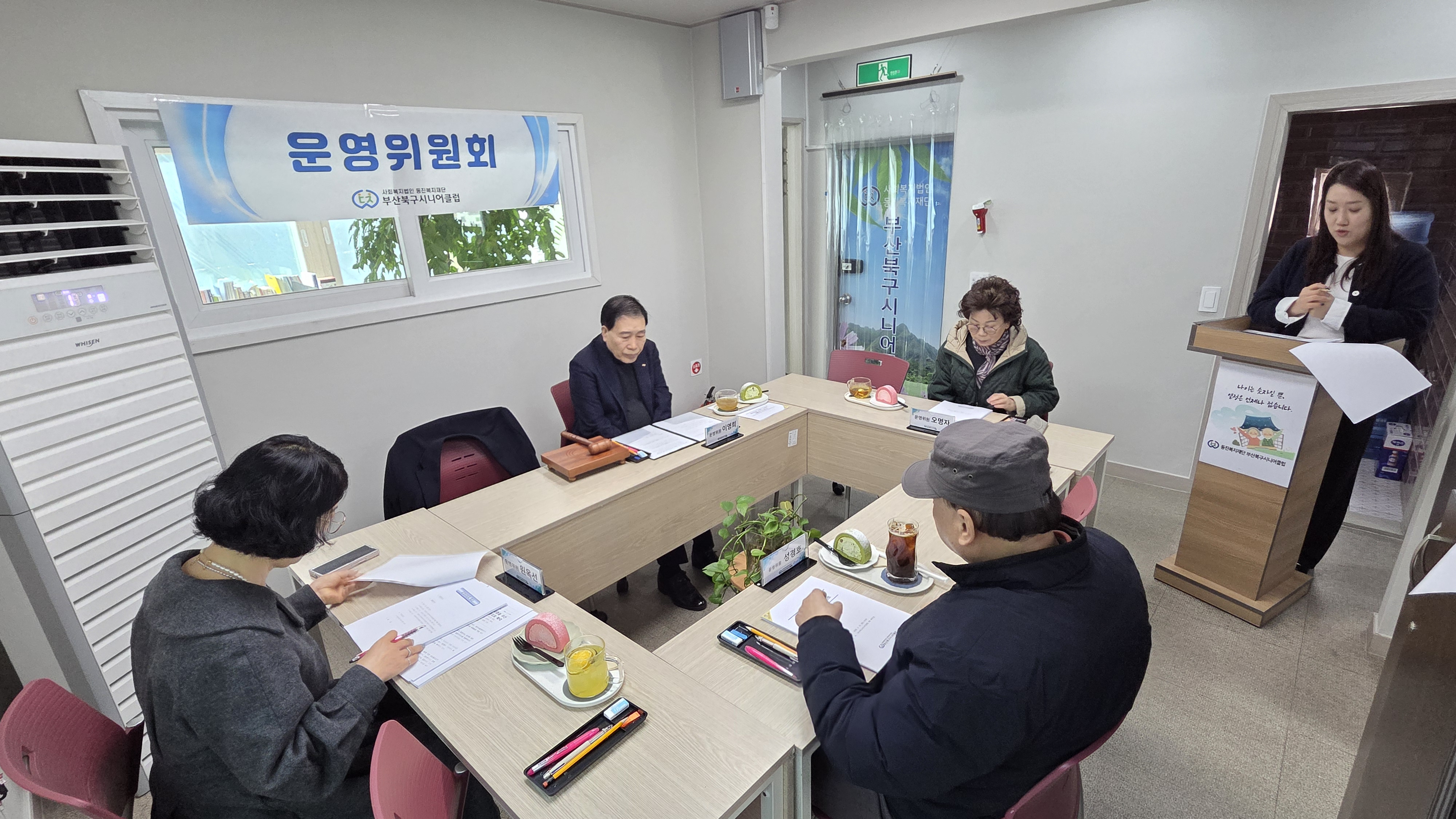 1. 일시 : 2026년 3월 10일 (월) 10:00 2. 장소 : 부산북구시니어클럽 4층 회의실 3. 참석인원 : 부산북구시니어클럽 운영위원 5명 4. 회의내용   가. 2025년 부산북구시니어클럽 세입, 세출 결산보고   나. 2025년 후원금 수입 및 사용내역 보고   다. 2026년 부산북구시니어클럽 1차 추가경정예산(안) 보고   라. 2026년 부산북구시니어클럽 1/4분기 사업 운영 현황 보고   마. 기타사항   |